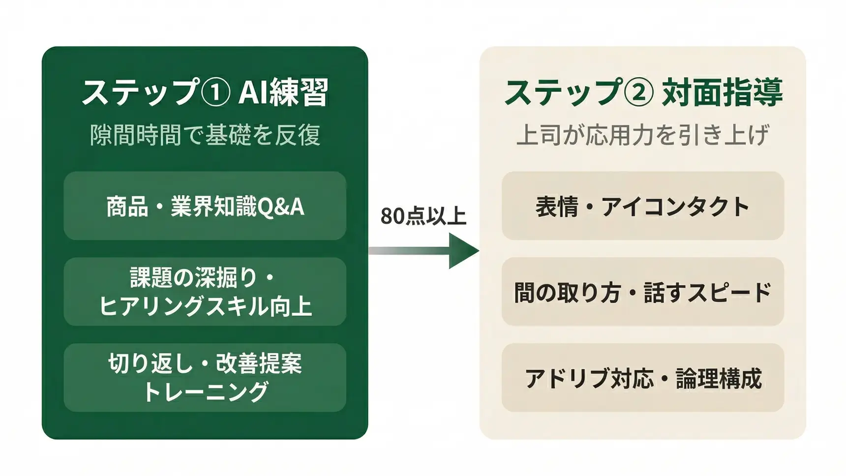 AIでの基礎練習で一定のスコア(例:80点以上)を達成したメンバーに対し、上司やマネージャーが対面で応用的なフィードバックを行います。
