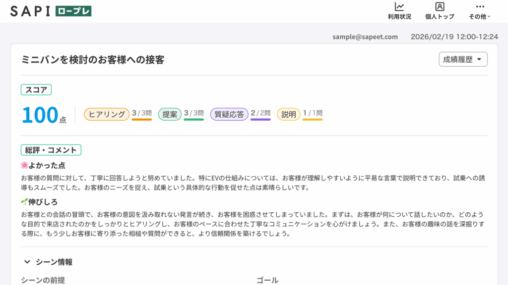AI ロープレツールの多くは、練習後に「80点」「Bランク」といったスコアを表示します。