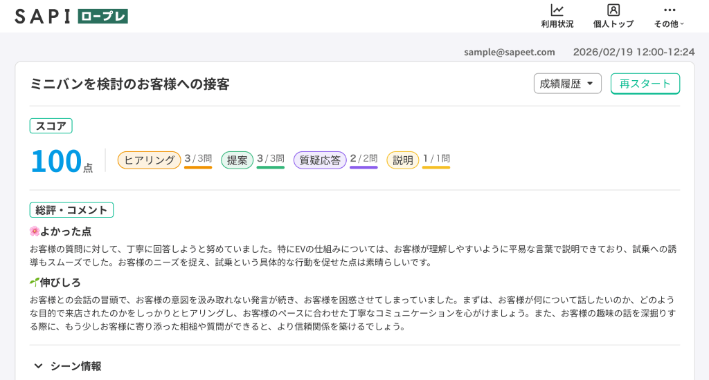 AIアバターと実際の営業・接客シナリオに基づいた会話が可能。マネージャーの時間を取ることなく、スタッフが好きなタイミングで繰り返し練習できます。