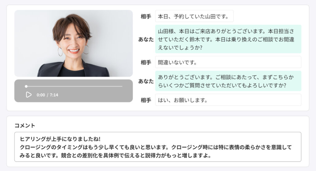 会話内容・表情の録画とコメント機能で、スタッフによる自己改善やマネージャーによるフィードバックができます。