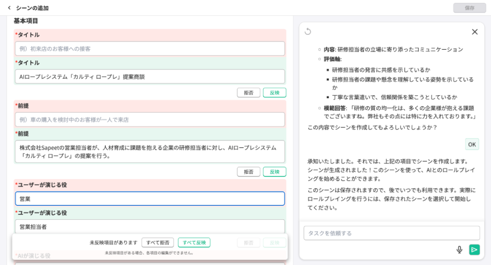 AIが作成したタイトル・前提条件・会話設定を確認し、反映ボタンを押すだけでシーン作成が完了します。